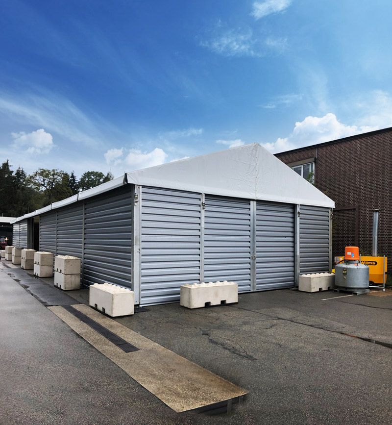 Mit unseren Industriezelten bieten wir flexible Lösungen für nahezu jeden Bedarf. Unsere Zelthallen können umfassend individualisiert und auf Ihre persönlichen Bedürfnisse und Anforderungen angepasst werden. Je nach Verwendungszweck und Aufstellort benötigen Sie eine Raumlösung in verschiedenen Ausmaßen. Wir nutzen eine modulare Bauweise mit unterschiedlichen Spannweiten, Traufhöhen und Rastermaßen. Dadurch ist die Hallenlänge frei wählbar und Umbauten sowie Erweiterungen jederzeit realisierbar. Sollten Sie im Laufe der Zeit mehr Fläche benötigen, können eine oder mehrere Elemente einfach an das bestehende Zelt hinzugefügt werden. Benötigen Sie weniger Platz? Dann lässt sich das Zelt einfach verkürzen, indem ein oder mehrere Bauteile abmontiert und die Rückwand entsprechend nach vorne verschoben wird. Auch das Umsetzen oder die Demontage von Industrie- und Lagerzelten ist problemlos möglich.